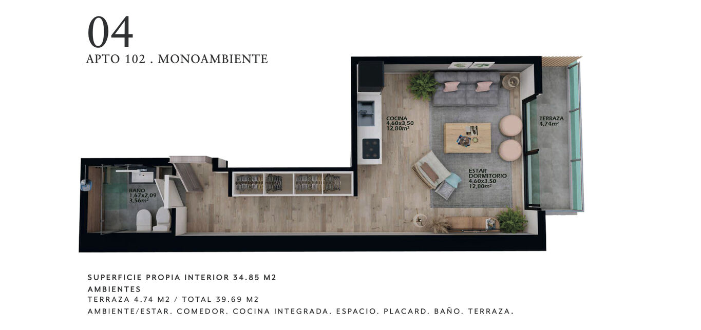 * U.102 – Monoambiente + cochera | 39,74 m² totales | USD 119.500**