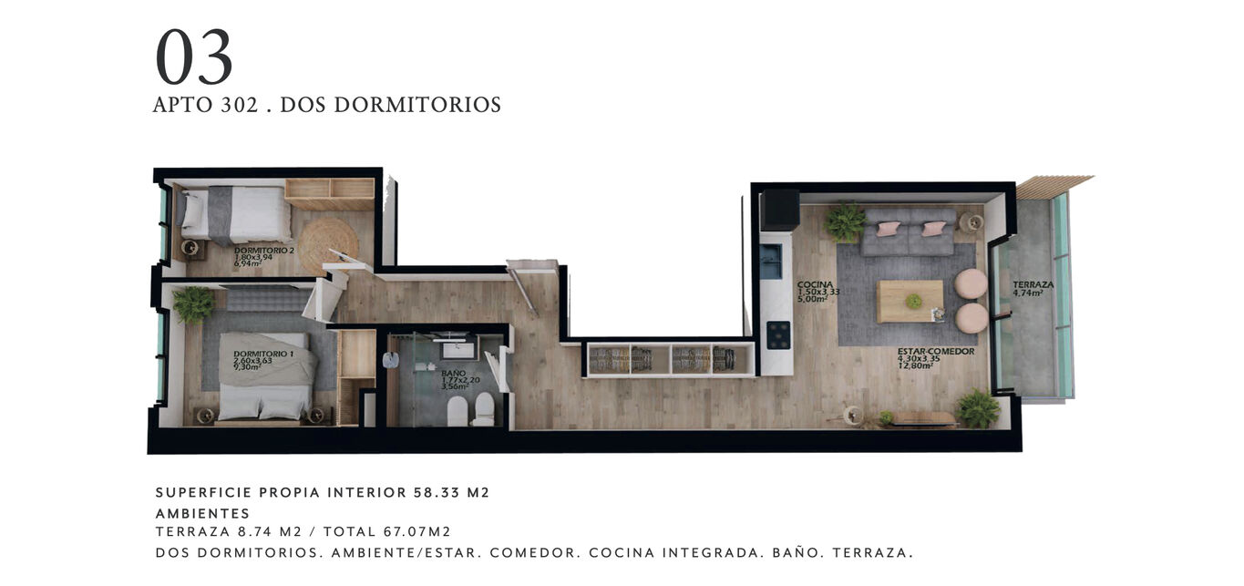 * U.302 – 2 dormitorios + cochera | 69,94 m² totales | USD 178.200**