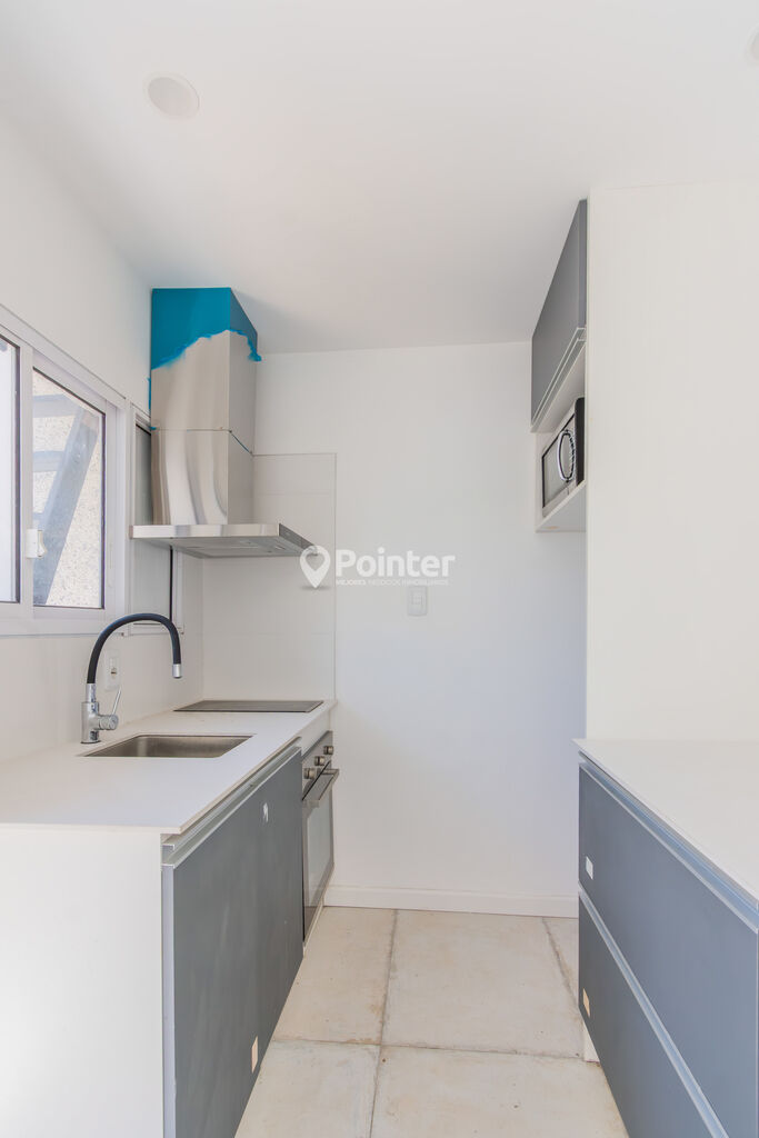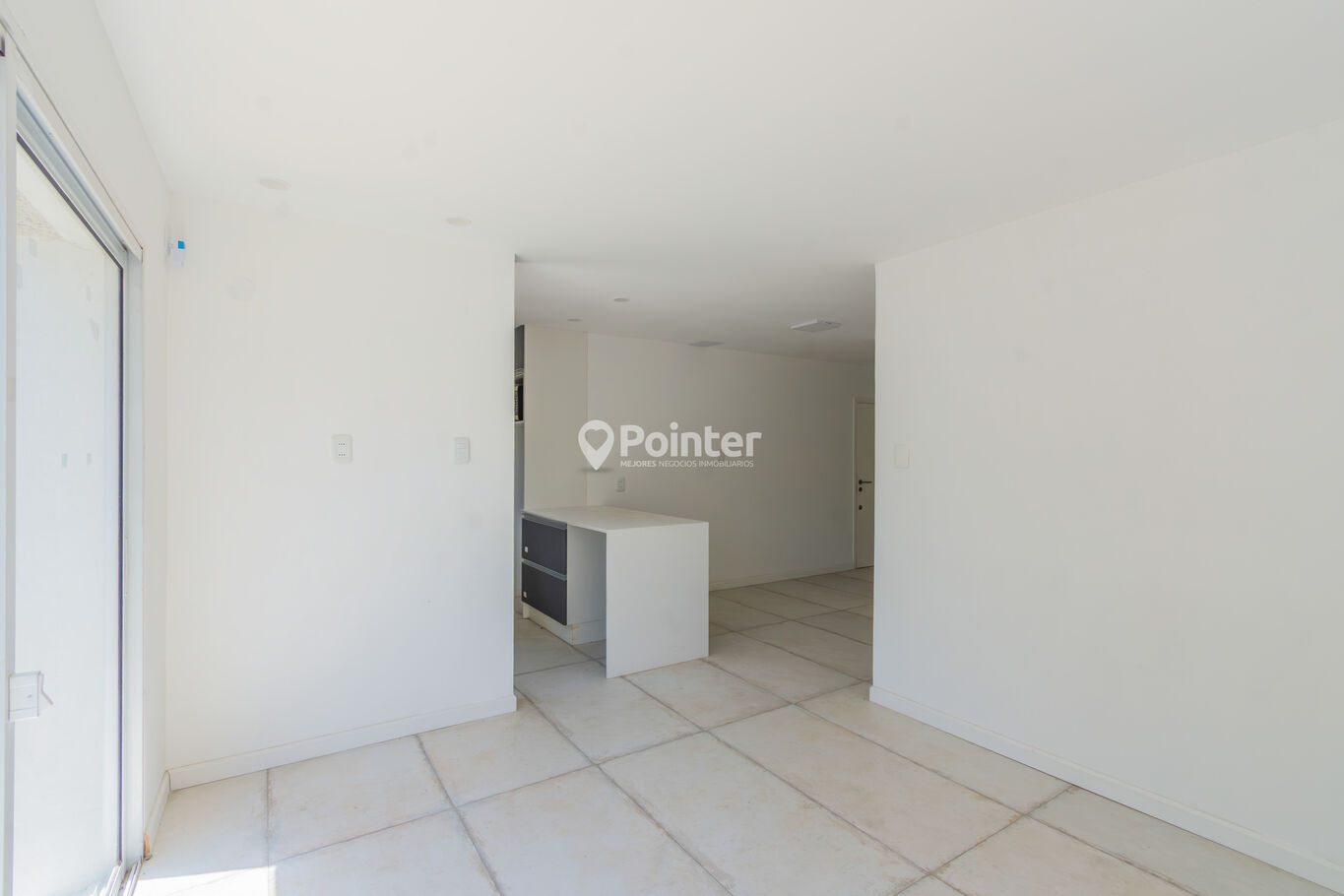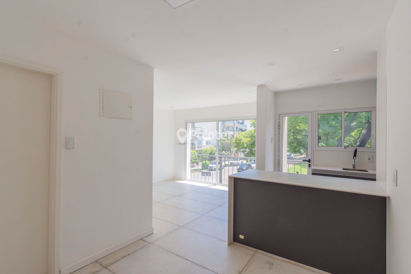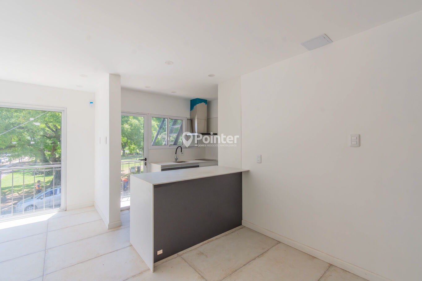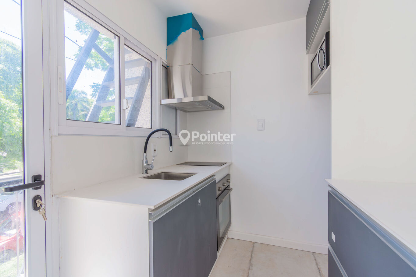 La cocina integrada está completamente equipada: horno, anafe, campana, microondas, extractor de aire, placares aéreos y bajo mesada. Lista para usar.