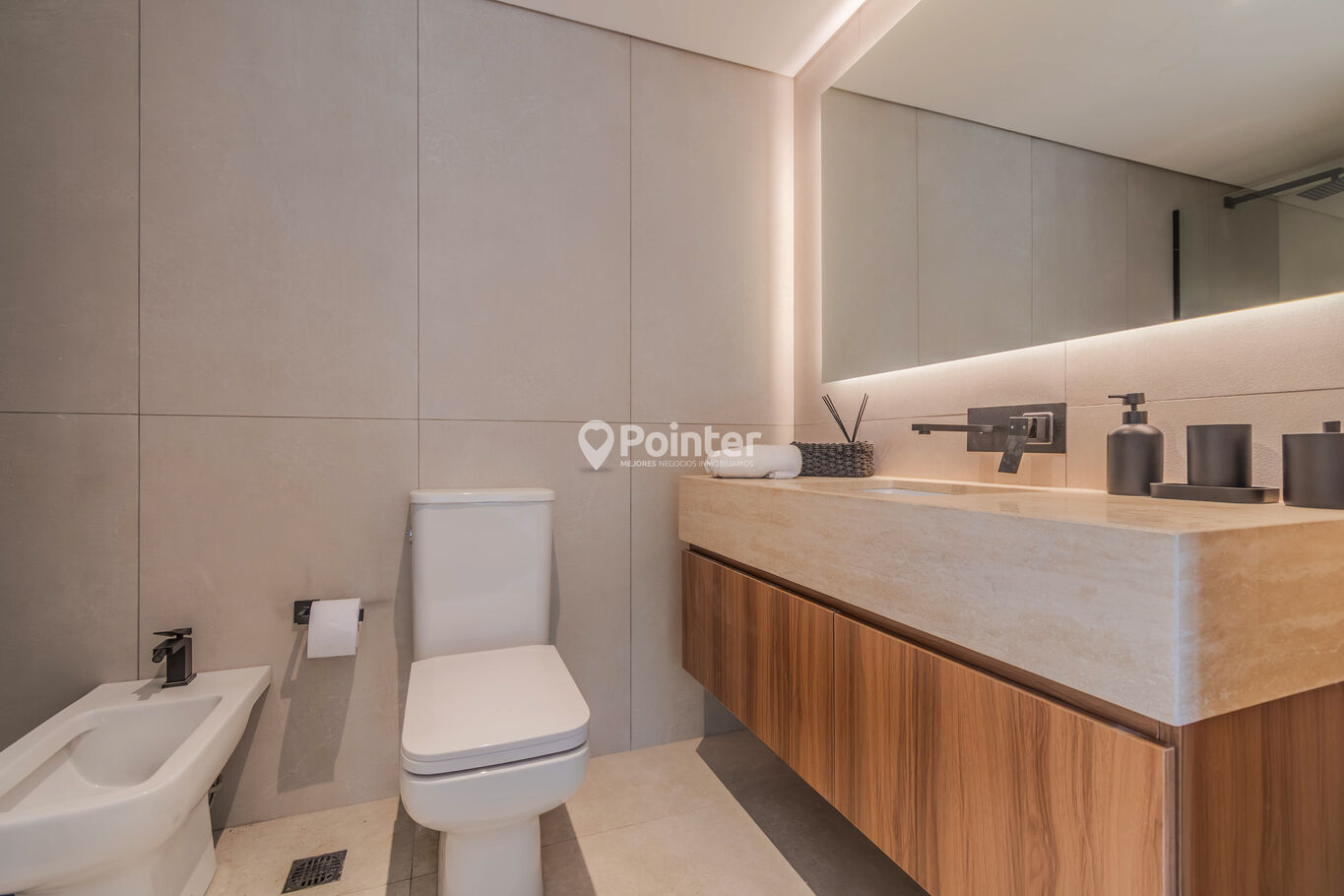 - Baños con diseño contemporáneo: bacha de travertino natural, griferías empotradas en negro y espejo retroiluminado