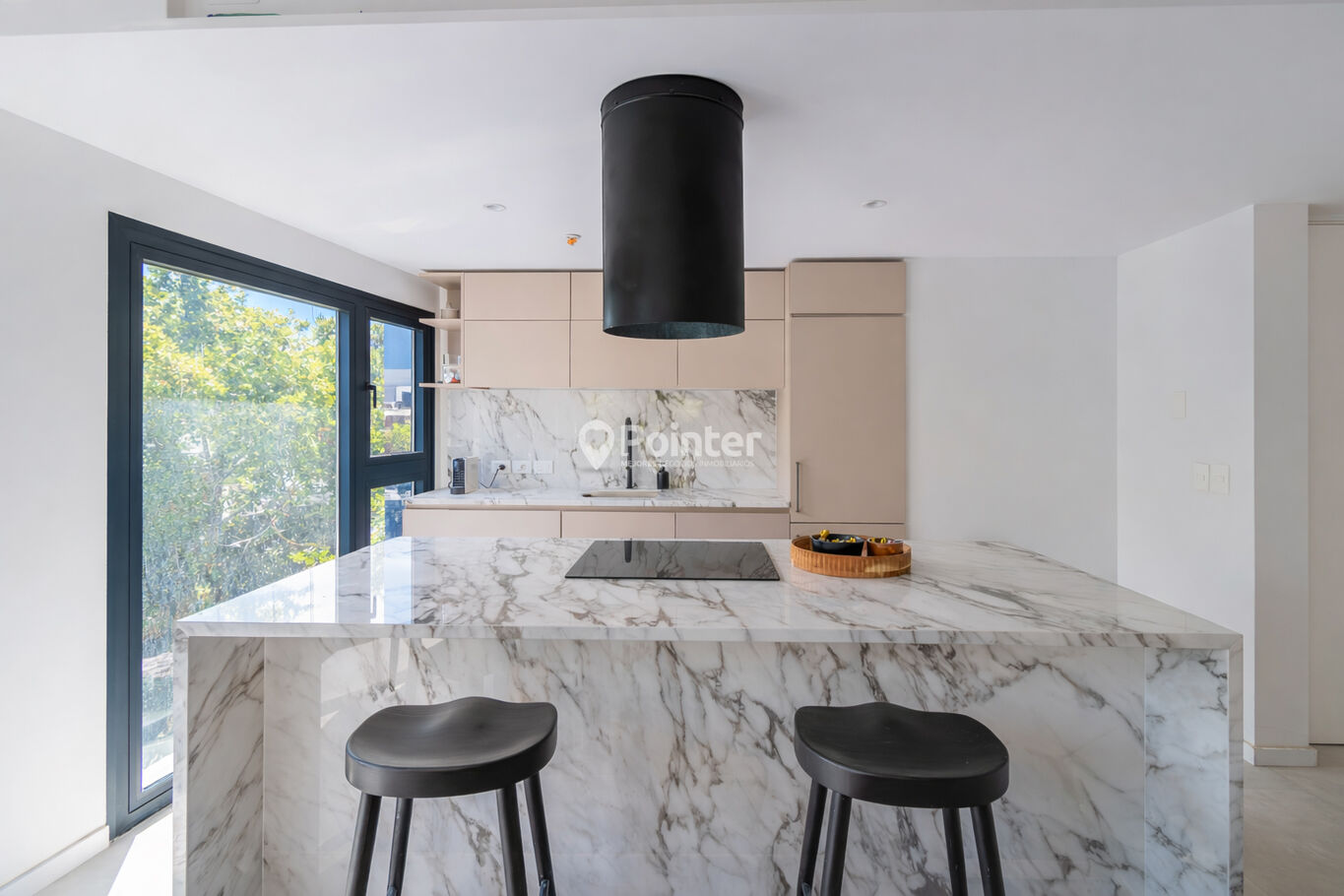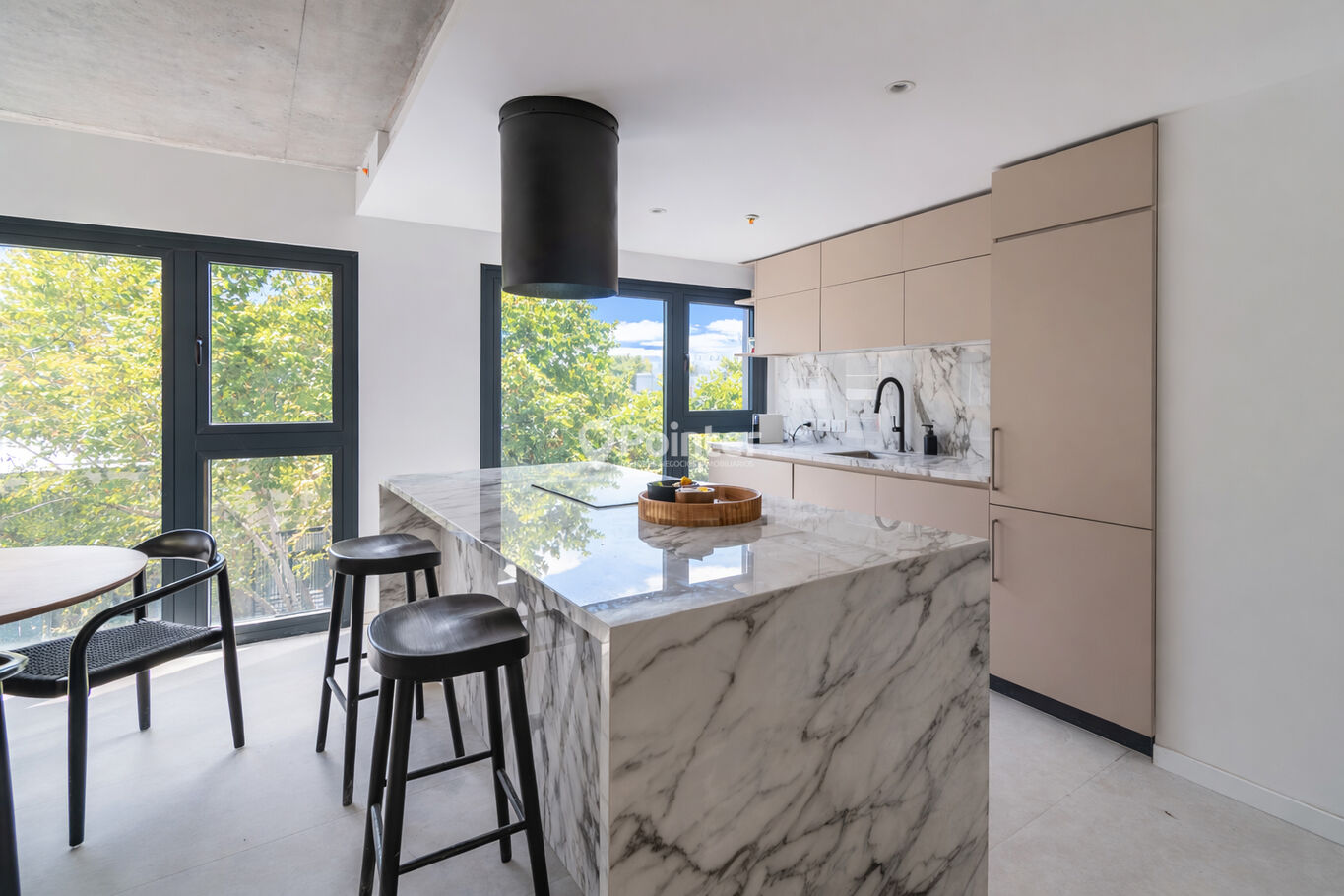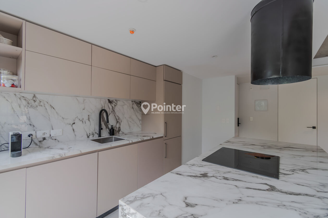 - Cocinas equipadas con mesadas en piedra AREBASCATO, mobiliario integrado y electrodomésticos (horno, anafe y campana)