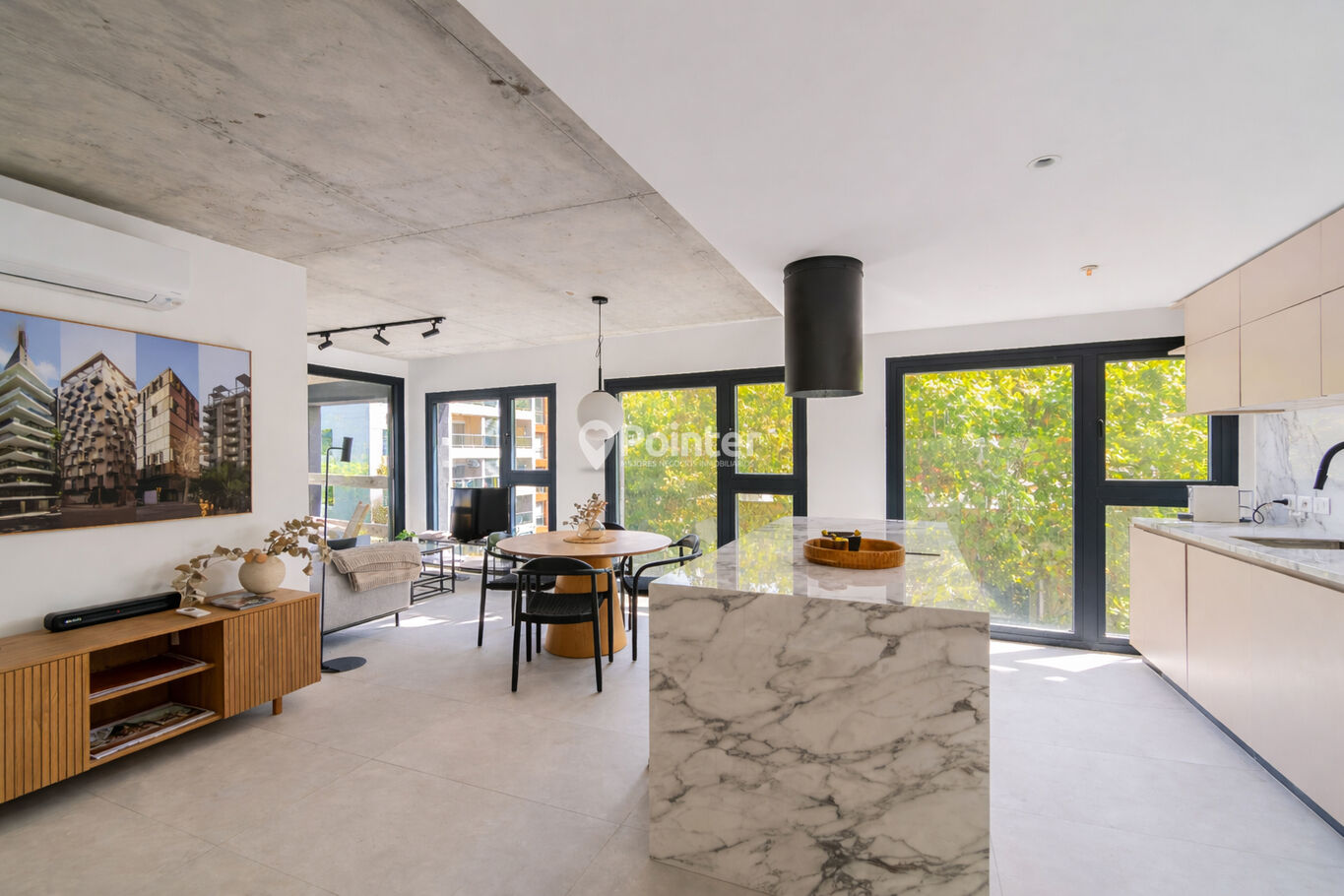 - Pisos de porcelanato de gran formato (120x60) en interiores y terrazas, aportando continuidad y durabilidad
