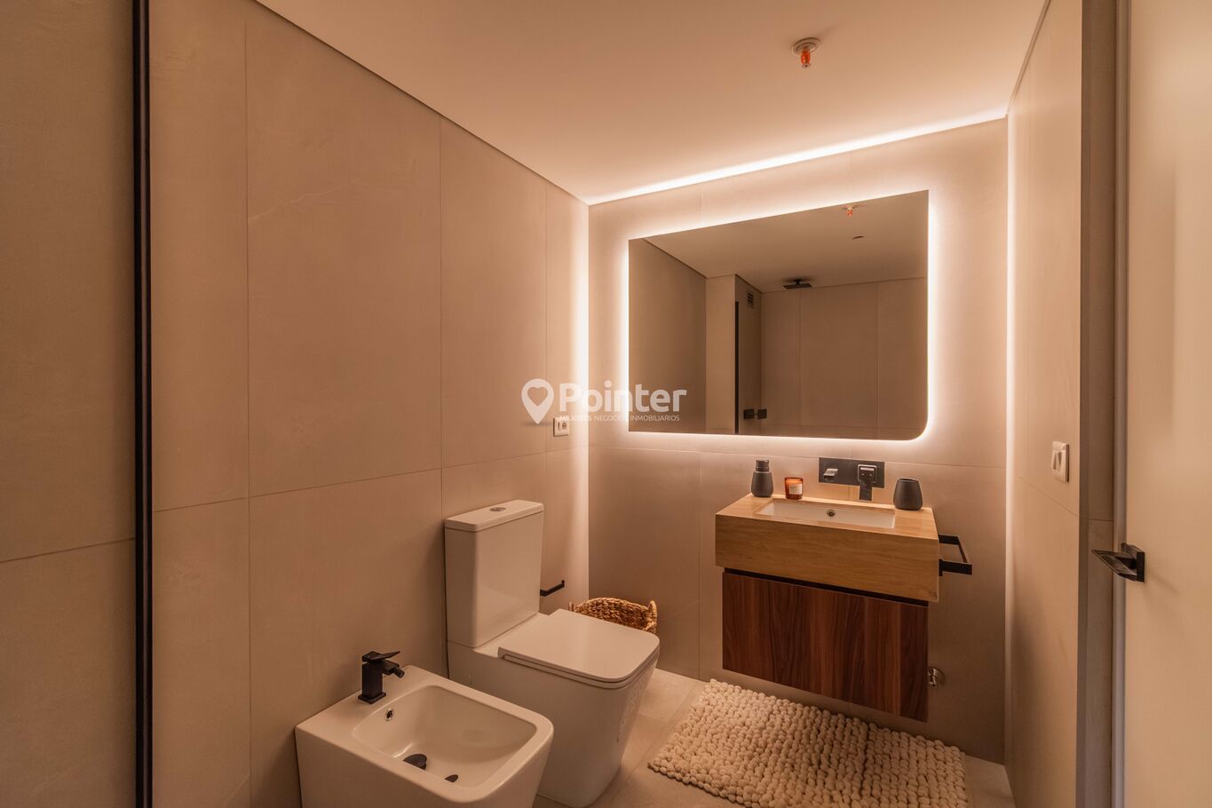 - Baños con diseño contemporáneo: bacha de travertino natural, griferías empotradas en negro y espejo retroiluminado