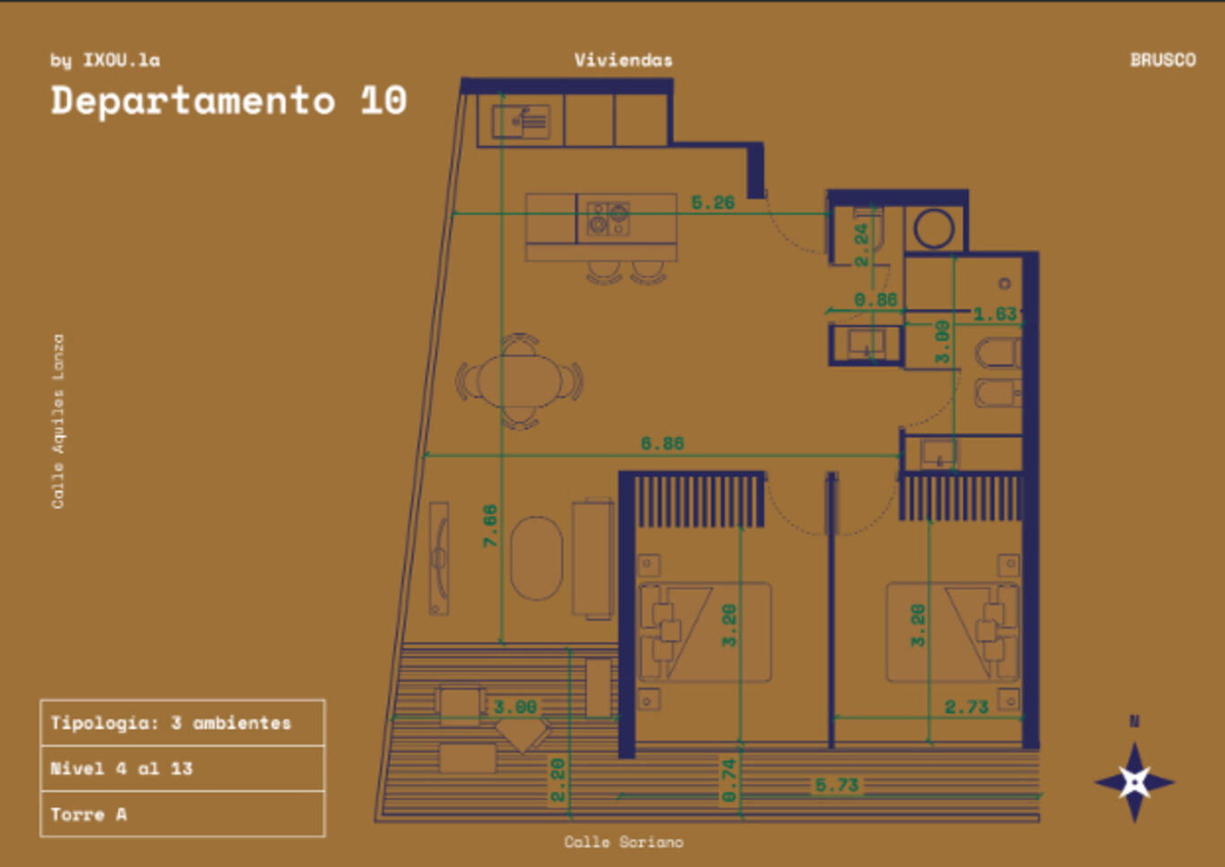 Plantas: El proyecto se compone de tres torres: Torre A de viviendas con 13 pisos, Torre B de viviendas con 11 pisos y Torre C de oficinas con 10 pisos. En total el desarrollo cuenta con 172 unidades de vivienda entre monoambientes, 1 y 2 dormitorios, además de oficinas, locales comerciales y espacios comunes con amenities como piscina exterior climatizada, gimnasio, terrazas con parrillero